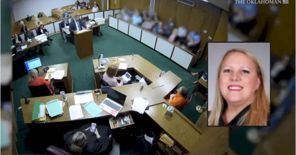 Il giudice distrettuale della contea di Lincoln (Oklahoma) Traci Soderstrom (screengrab di YouTube tramite The Oklahoman). Nel riquadro: Traci Soderstrom (tramite la rete dei tribunali statali dell'Oklahoma).